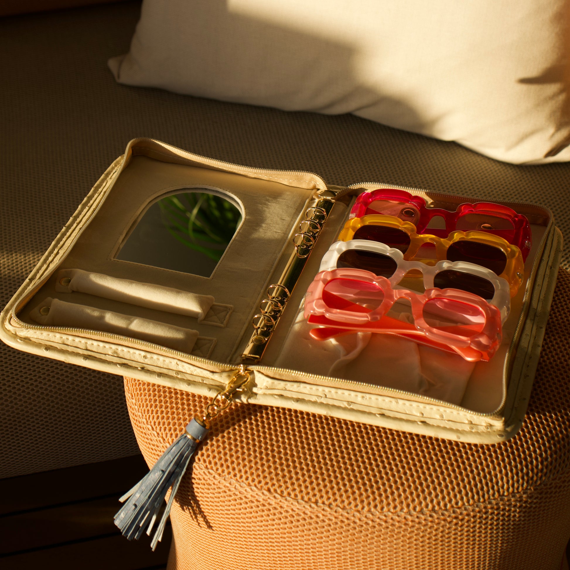 This luxury accessory travel binder is unlike anything on the market! multi-functional and perfect for over-packers of jewelry and sunglasses. Keep your accessories organized and stylishly protected while on the go. No more tangled necklaces or scratched sunnies!