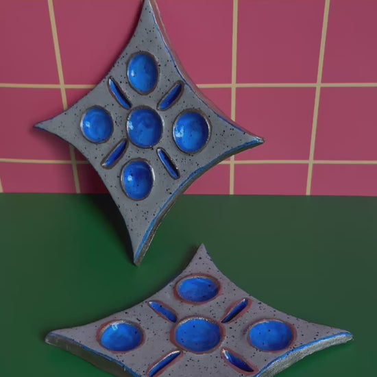 Say goodbye to lost earrings and rings with these delightful Starry Night ring dishes. Each piece features a moody midnight blue finish accented with gold details and earthy, textured sides within a diamond-shaped star. Position rings vertically in dedicated slots or horizontally in recessed areas—no matter the band width, they're secure. Those tiny studs and dainty earrings that mysteriously disappear? Problem solved! Stack multiple rings to hold even more than the 8 carved spaces, turning your jewelry storage into a celestial display that's as functional as it is fun!
